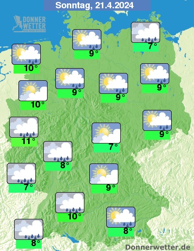 Am Sonntag gibt es in der Nord- und Osthälfte einen Wechsel aus Sonne und Wolken, nur vereinzelt muss hier mit Schauern gerechnet werden. In den übrigen Landesteilen überwiegt am Sonntag wechselnde oder starke Bewölkung und und immer wieder muss mit Schauern und einzelne Gewittern gerechnet werden, teils auch mit Graupel. Im Bergland liegt die Schneefallgrenze oberhalb von 500 bis 800 m.