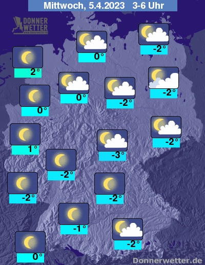 In der folgenden Nacht zeigt sich der Himmel über der Republik überwiegend sternenklar, vor allem im Osten und Nordosten ziehen zum Teil dichte Wolken durch. Bei Tiefstwerten von 2 Grad an der Nordsee und -3 Grad im Vogtland bleibt es trocken.