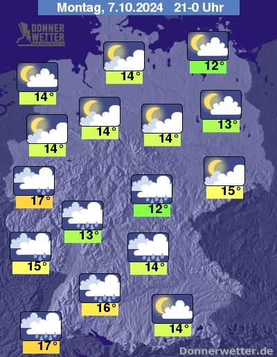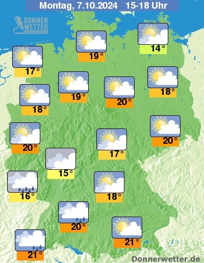 Am Montagnachmittag zeigt sich der Himmel über weiten Landesteilen wechselnd bewölkt. An Weser, Oder sowie im Südosten sind auch längere heitere Abschnitte möglich. Dichtere Wolken halten sich am Nachmittag im Südwesten, dabei fällt hier teils schauerartiger Regen. In den übrigen Landesteilen bleibt es meist trocken.