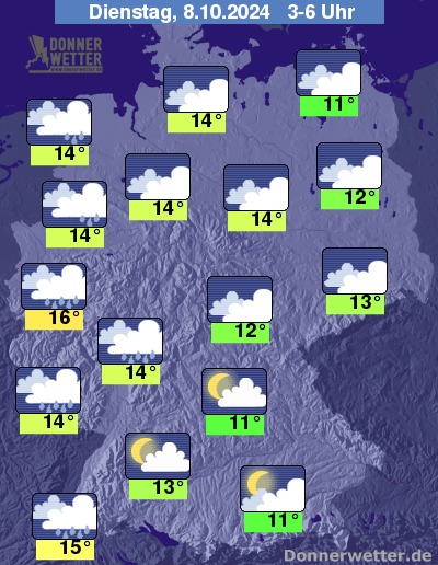 In der Nacht zum Dienstag breiten sich teils kräftige und schauerartige Niederschläge von Südwesten bis in die mittleren Landesteile aus. In den übrigen Landesteilen bleibt es bei wechselnder bis aufgelockerter Bewölkung weitgehend trocken.