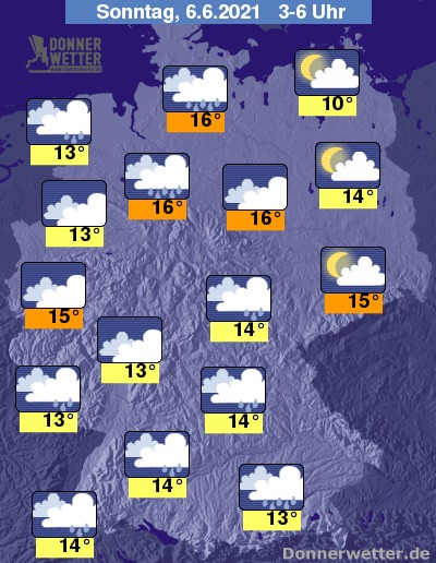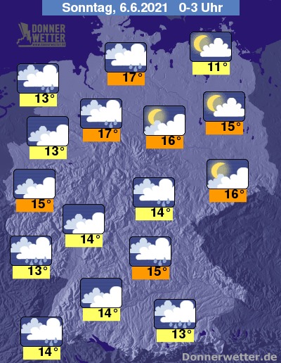 In der Nacht auf Sonntag bleibt es bei teils lockerer, teils aufgelockerter Bewölkung östlich der Elbe weitgehend trocken. In den übrigen Landesteilen ist die Wolkendecke zumeist geschlossen oder es ist stark bewölkt; vor allem im Nordwesten sowie südlich des Mains können im Nachtverlauf immer wieder teils kräftige Schauer fallen, auch lokale Gewitter sind nach wie vor möglich. Lokal besteht weiterhin Unwettergefahr.