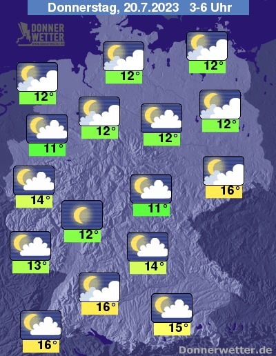 In der Nacht zum Donnerstag zeigt sich der Himmel zumeist nur locker bis wechselnd bewölkt. Vor allem vom Osten bis hoch zur Ostsee können sich bei teils dichten Wolken noch einzelne Schauer bilden, sonst bleibt es trocken. Die Temperatur sinkt auf 16 Grad am Oberrhein und bis 11 Grad im Münsterland.