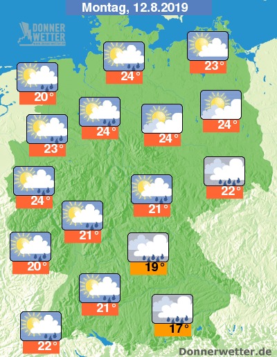 Zum Wochenstart halten sich über dem Süden und Osten meist dichte Wolken aus denen es gebietsweise regnet, sonst ist es teils heiter, teils dicht bewölkt und es können sich einzelne Schauer und lokale Gewitter bilden. Die Temperatur steigt auf 17 Grad in Rosenheim und bis 24 Grad in Berlin.