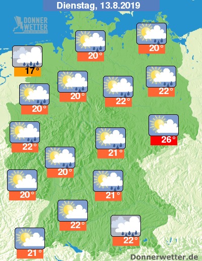 Am Dienstag bilden sich besonders über der Nordhälfte zwischen heiteren Abschnitten auch gebietsweise Schauer sowie lokale Gewitter. Weiter nach Süden hin ist es wechselnd bis stark bewölkt, bis auf seltene Schauer bleibt es hier trocken. Die Temperatur steigt auf 17 Grad an der Nordsee und bis 26 Grad in der Lausitz.