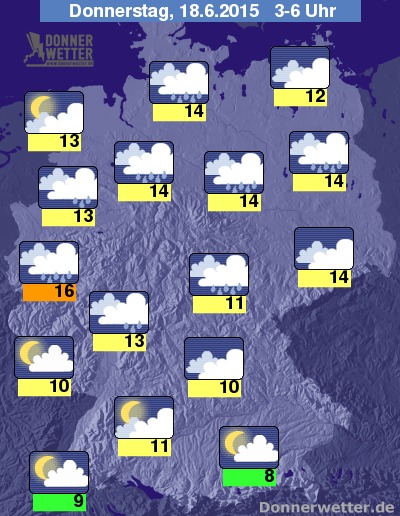 In der kommenden Nacht bleibt es im Süden bei lockerer bis aufgelockerter Bewölkung weitgehend trocken. In den übrigen Landesteilen ziehen von Norden her jedoch oft dichte Wolken durch und es fällt zeitweise, zum Teil auch kräftiger Regen. Gegen Morgen lockert es von Nordwesten her wieder auf und es bleibt nachfolgend trocken. Die Temperatur sinkt auf 16 Grad im südlichen Rheinland und bis 8 Grad im Chiemgau.