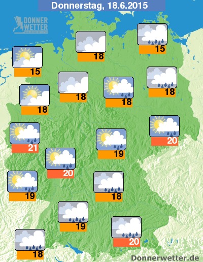 Am Donnerstag zieht verbreitet wechselnde oder starke Bewölkung durch, dazu bleibt es im Norden und Westen vielerorts auch trocken, gebietsweise fällt hier jedoch auch Regen. In den anderen Landesteilen fällt zeitweise, zum Teil schauerartiger Regen. Die Temperatur steigt auf kühle 15 Grad an den Küsten und bis etwa 21 Grad in Köln.