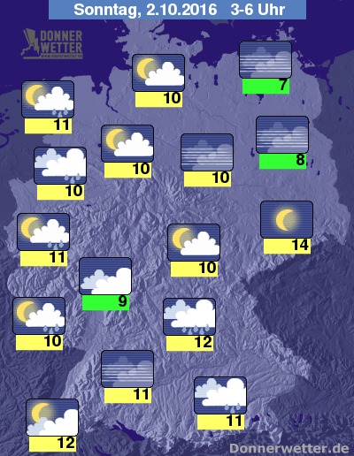 In der Nacht zum Sonntag ist der Himmel über Deutschland oft locker bewölkt oder klar. Vor allem über Bayern bleibt es aber meist bedeckt und dazu regnerisch. Einzelne Schauer bilden sich über den westlichen Landesteilen, sonst bleibt es hingegen weitgehend trocken. Die Temperatur sinkt auf 14 Grad in Dresden und bis 7 Grad an der Müritz.