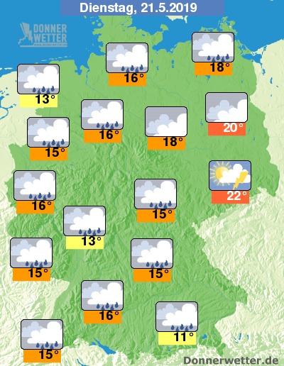Am Dienstag bleibt es weiterhin verbreitet stark bewölkt, dabei bilden sich vom Osten bis zur Landesmitte hin zeitweise Schauer und lokale Gewitter, sonst fällt zeitweise, teils langanhaltender Regen. Die Temperatur steigt auf 11 Grad am Bayerischen Wald und bis 22 Grad in Leipzig.
