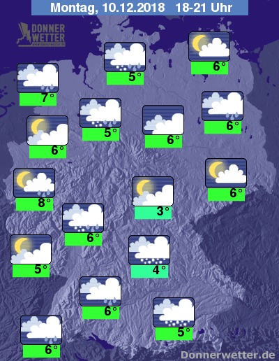 In den späten Abendstunden zeigt sich der Himmel meist bedeckt oder aufgelockert bewölkt, vor allem in der Süd- und Westhälfte muss zudem immer wieder mit Regen- oder Schneeregen, südlich den Mains auch teils mit Schneeschauern gerechnet werden.