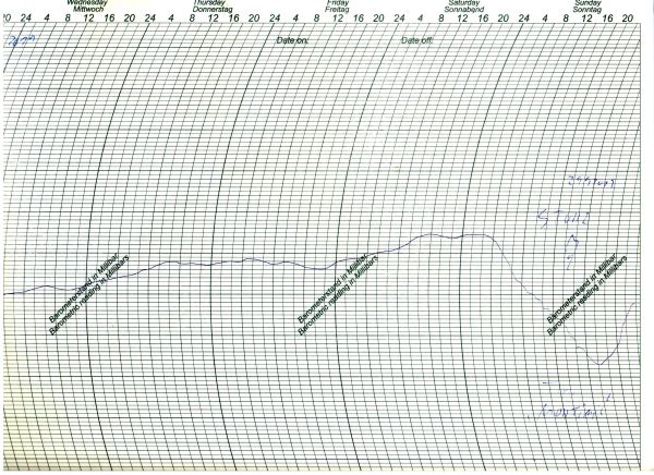 Wunderbar zu erkennen gibt sich der Herbststurm auch auf unserem Luftdruckschrieb der letzten Tage - deutlich erkennbar ist der rapide abfallende Luftdruck in der frühen Morgenstunden des Sonntag.