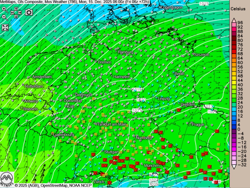 Im Dauernebel erreichen die Höchstwerte heute teils Werte unter 5 Grad, sonst Temperaturen um 6 bis 12 Grad.