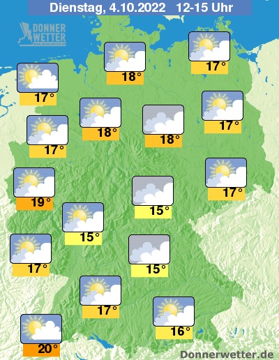 Heute Abend zeigt sich das Wetter überwiegend heiter oder sonnig, hin und wieder zieht auch mal stärkere Bewölkung durch, jedoch bleibt es trocken. Die Temperatur liegt bei 16 Grad in Nürnberg und bis 21 Grad in Köln.