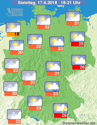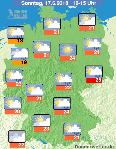 Heute Nachmittag scheint sowohl im Norden als auch im Südwesten bei überwiegend nur lockeren Wolken häufig die Sonne, dazu ist es hier weitgehend trocken. Im übrigen Land ist es dagegen zumeist stark bewölkt, vor allem von Bayern bis nach Sachsen bilden sich wiederholt Schauer und auch einzelne Gewitter. In den übrigen Regionen sind einzelne Schauer möglich. Die Temperatur liegt bei 18 Grad an der Nordsee und etwa 25 Grad in der Lausitz.