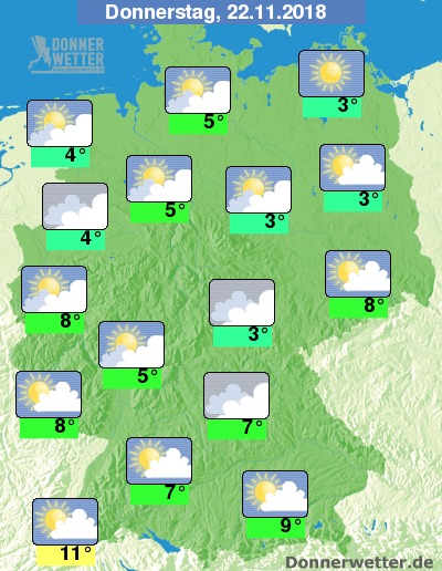 Es hält sich zunächst allgemein wieder eine dichte Wolkendecke, vor allem in höheren Lagen ist es auch neblig-trübe. Vereinzelt fällt etwas Sprühregen, im Bergland ist eventuell auch geringer Schneefall möglich. Regional, insbesondere über Mecklenburg-Vorpommern gibt es aber auch größere Aufheiterungen und längere sonnige Abschnitte. Im Tagesverlauf kämpft sich auch in anderen Gebieten stellenweise die Sonne durch.
