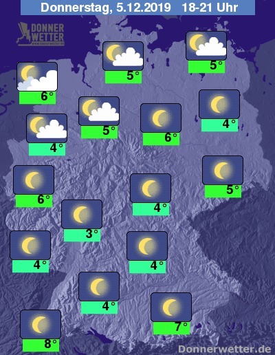 Während der zweiten Nachthälfte beginnt es im Nordseeumfeld zu tröpfeln, sonst wechseln sich Wolken, Mond und Sterne miteinander ab. Im Osten und Süden bleibt es meistens wolkenlos. Hier kann sich jedoch stellenweise wieder Nebel bilden, oder vorhandener Nebel verdichten.