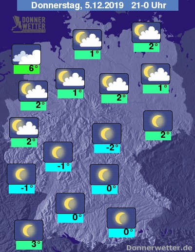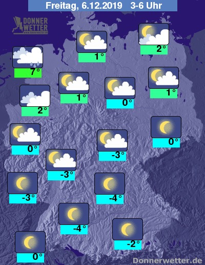 Bis zu den Frühstunden kühlt die Luft in der Mitte und im Süden in den frostigen Bereich von -5 bis 0 Grad ab und es muss mit Reifglätte gerechnet werden. Im Norden gibt es bei leicht positiven Temperaturen höchstens leichten Bodenfrost. Am mildesten bleibt es mit bis zu 7 Grad im Bereich der Nordseee. Hier bläst dafür stürmischer Südwestwind.