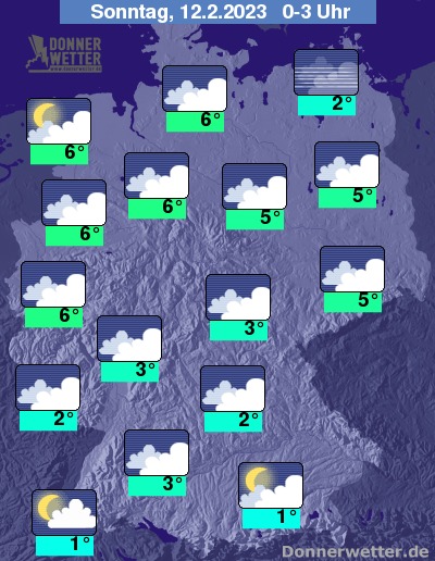 In der Nacht auf Sonntag bleibt der Himmel über weiten Landesteilen stark bewölkt oder es ist bedeckt; bei lockerer oder aufgelockerter Bewölkung bleibt es in den Gebieten südlich der Donau. Stellenweise kann sich Nebel bilden.