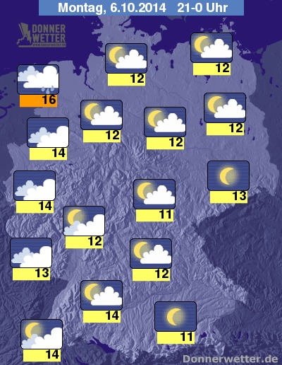 Am Abend werden die Wolken nach Westen hin dichter, dabei kann an der Grenze zu den Niederlanden hier und da auch etwas Regen fallen, sonst bleibt es meist trocken. In der Osthälfte ist es dagegen meist aufgelockert bewölkt, im Osten und Südosten ist es häufig sternenklar, dazu bleibt es trocken. Die Abendtemperatur liegt bei 16 Grad in Emden und rund 10 Grad am Bayerischen Wald.