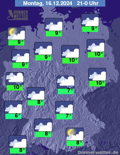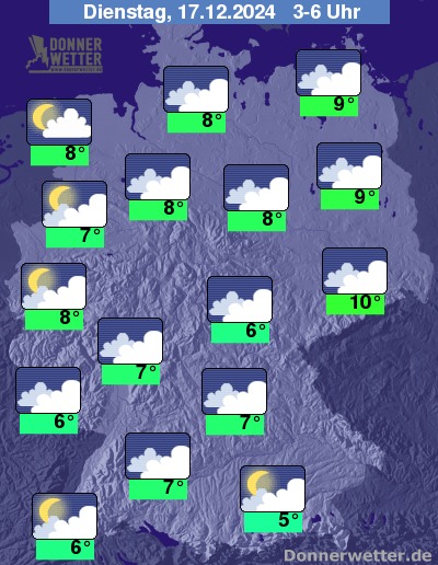 In der Nacht zum Dienstag bleibt der Himmel verbreitet stark bewölkt oder bedeckt, Auflockerungen gibt es am ehesten im Südwesten und am Alpenrand. In der Mitte und im Nordosten kann in der Nacht zeitweise etwas Regen oder Sprühregen fallen, sonst bleibt es meist trocken.