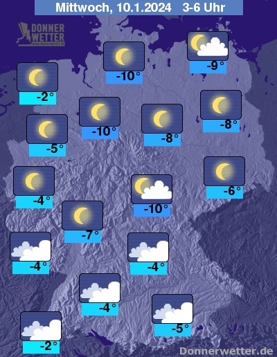 Die Temperaturen gehen im Flachland zurück auf Werte um -2 bis -10 Grad, im Bergland bei Aufklaren mitunter Tiefstwerte bis -15 Grad.