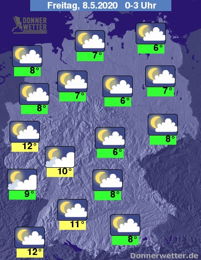 In der Nacht auf Freitag wird der Himmel nahezu im ganzen Land von hohen und mittelhohen Schleierwolken getrübt, so dass man die meisten Sterne und den Mond nur verschwommen erkennen kann. Gebietsweise, vor allem in der Landesmitte und regional im Westen, kann die Bewölkung auch dichter sein. Schauer sind in der Nacht aber nicht zu erwarten.