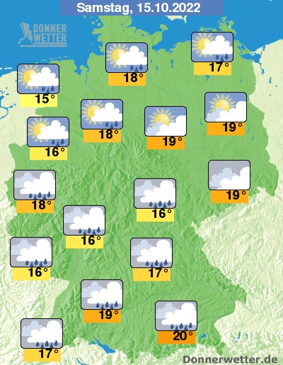 Am Samstag ziehen überwiegend dichte Wolken durch, dabei bilden sich gebietsweise Schauer. Im Norden und Osten ist es aber oft auch locker bewölkt, hier bleibt es zumeist trocken. Die Temperatur erreicht 15 Grad in Cuxhaven und bis 20 Grad in München. An der Nordsee weht ein oft stürmischer Wind.