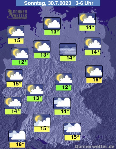 In der folgenden Nacht ist es oft nur locker, vor allem aber im Süden und Nordwesten auch stark bewölkt, hier sind einzelne Schauer möglich. Im übrigen Land bleibt es weitgehend trocken. Die Temperatur sinkt auf 16 Grad in Freiburg und 12 Grad in Erfurt.