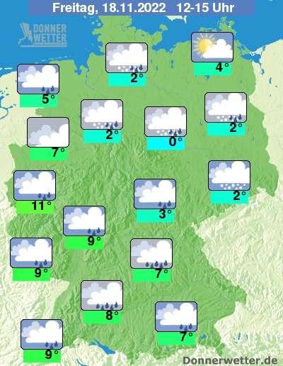 Heute Nachmittag ziehen größtenteils dichte Wolken übers Land hinweg und Aufheiterungen sind eher selten. Stattdessen fällt gebietsweise Regen, über der Nordosthälfte Deutschlands überwiegend Schneeregen oder Schnee. Die Temperatur liegt bei 0 Grad in der Magdeburger Börde und 11 Grad im Rheinland.