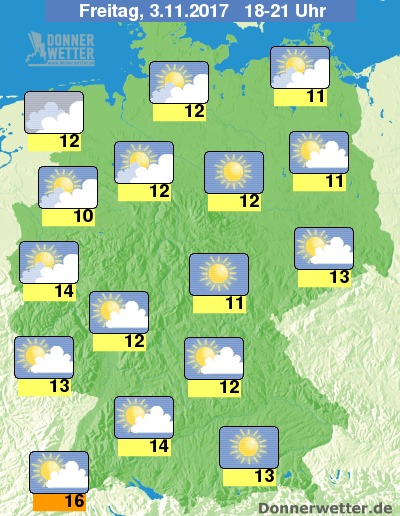 Heute Abend scheint über weiten Landesteilen die Sonne bei dann meist nur lockeren Wolken oder auch von einem wolkenlosen Himmel. Mehr und zum Teil auch dichte Wolken ziehen über den Nordwesten hinweg. Es bleibt überall trocken bei 11 bis 14, im Breisgau bis 16 Grad.