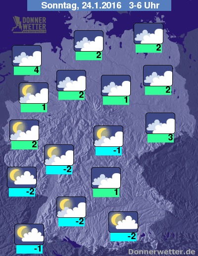 In der kommenden Nacht bleibt es über dem Norden und Osten weitgehend bedeckt und teils trüb, dabei fällt im äußeren Osten noch hier und da etwas Sprühregen, sonst bleibt es weitgehend trocken. Im Südwesten und im äußeren Süden zeigt sich der Himmel meist sternenklar oder leicht bewölkt, in den übrigen Landesteilen ist es teils stark, teils aufgelockert bewölkt, dabei bleibt es trocken. Die Temperatur sinkt auf 4 Grad an der Nordsee und bis -2 Grad in Stuttgart. Stellenweise bildet sich Nebel oder Hochnebel.