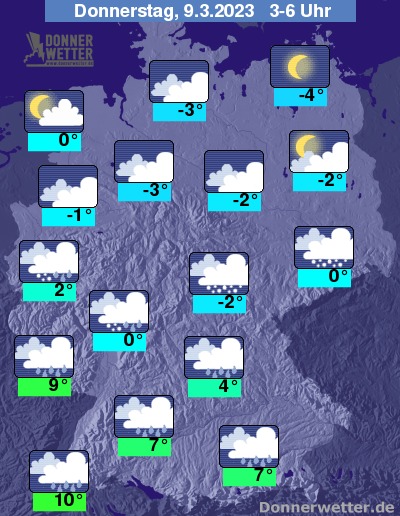 In der bevorstehenden Nacht ist der Himmel lediglich im Norden oft nur leicht bis aufgelockert, sonst jedoch weitgehend dicht bewölkt. Über der Nordhälfte bleibt es dabei weitgehend trocken, südlich angrenzend fällt oft Schnee oder Schneeregen. Etwa südlich des Mains fallen die Niederschläge als Regen. Die Temperatur sinkt auf milde 10 Grad in Freiburg und bis -4 Grad in Stralsund.