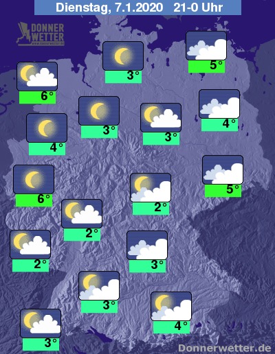 Während der zweiten Nachthälfte klart es auch im Osten auf. Sonst wechseln sich Wolken und Sterne miteinander ab. Im Süden bilden sich gebietsweise Nebelfelder aus oder verdichten sich.