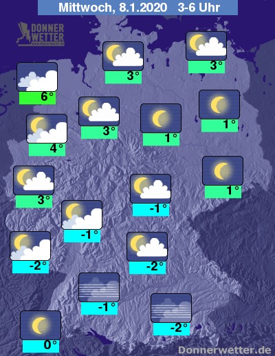 Bis zu den Frühstunden kühlt die Luft in der Nordhälfte auf 0 bis 6 Grad ab, am mildesten bleibt es an der Emsmündung. In der Südhälfte gibt es verbreitet leichten Frost zwischen -3 und 0 Grad und es muss mit Glätte durch Reif oder überfrierende Nässe gerechnet werden.
