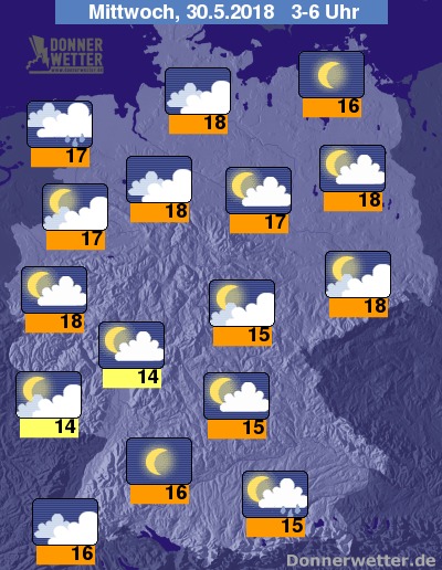In der Nacht zum Mittwoch halten sich über dem Nordwesten dichte Wolken, dazu fällt hier zeitweise Regen, sonst ist es meist leicht bis aufgelockert bewölkt und es bleibt weitgehend trocken. Die Temperatur sinkt auf 18 Grad in Hamburg und bis 14 Grad im Saargau.
