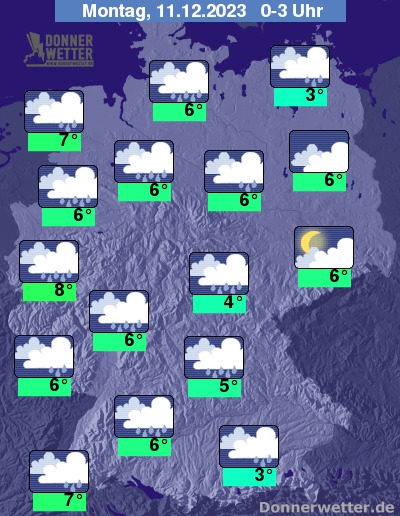 In der Nacht auf Montag breitet sich von West nach Ost neuer Regen aus, im Nachtverlauf auch in Schauer übergehend. Im Süden steigt die Schneefallgrenze auf über 1000 m an.