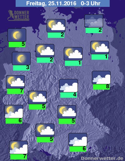 In der Nacht kühlt es vor allem im Norden deutlich ab. Unter teils klarem Himmel fallen die Temperaturen auf Werte knapp über dem Gefrierpunkt. Unter dichten Wolken sind im Osten des Landes bis 8 Grad möglich.