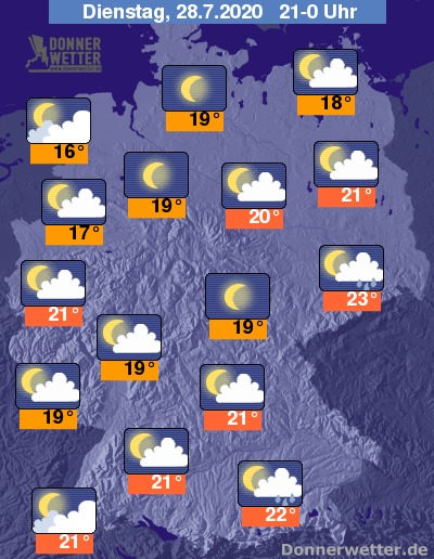 Die Temperaturen sinken am späteren Abend auf Werte um 23 Grad in Dresden und 16 Grad an der Nordseeküste ab.