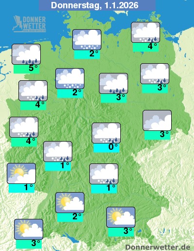 Heute bleibt es lediglich südlich des Mains oft heiter oder sogar sonnig, dabei bleibt es hier trocken. Im übrigen Bundesgebiet ist es zumeist bedeckt, dabei fällt zeitweise Schnee oder Schneeregen, besonders im Norden eher Regen oder Schneeregen. Die Temperatur steigt auf 0 Grad in Erfurt und bis 5 Grad in Cuxhaven. Über der Nordhälfte ist es oft stürmisch, an der See herrscht verbreitet Sturm.
