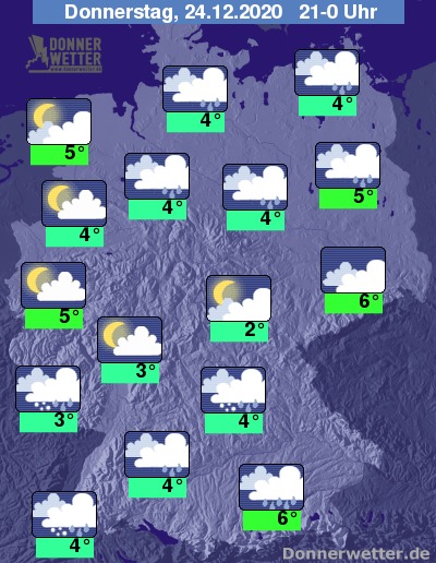 Während der zweiten Nachthälfte treten regional Regen- oder Schneeregen-, im Bergland auch Schneeschauer auf. Sonst leuchten neben durchziehenden Wolkenfeldern auch zeitweise Halbmond und Sterne.