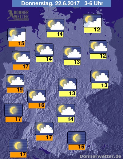 In der folgenden Nacht ziehen vor allem an den deutschen Küsten oft einige, meist jedoch noch aufgelockerte Wolken durch. In den übrigen Landesteilen ist es weitgehend locker bewölkt, besonders im Süden zeigt sich ein oft sternenklarer Himmel. Es bleibt landesweit trocken bei Tiefstwerten zwischen 19 und 12 Grad.
