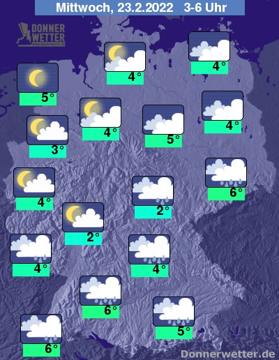 Am Mittwoch ist es vielerorts heiter bis sonnig, gebietsweise ziehen aber auch dichte Wolken durch, dabei bleibt es trocken. Die Temperatur steigt auf 7 Grad im Eichsfeld und bis 11 Grad im Oberrheingraben. An der Nordsee, im Nordosten und Osten ist es zum Teil stürmisch, an der Ostsee herrscht teils Sturm.