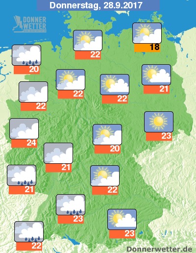 Am Donnerstag ist es über den östlichen Landesteilen vormittags noch heiter bis sonnig und trocken. Im übrigen Bundesgebiet zieht jedoch bereits oft dichte, teils auch aufgelockerte Bewölkung durch. Vom Südwesten, über den Westen bis zur Nordsee können sich lokale Schauer bilden, sonst bleibt es weitgehend trocken. Die Temperatur erreicht 18 Grad an der Ostsee und bis 24 Grad in der Kölner Bucht.