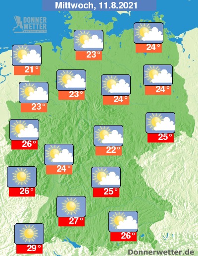 Am Mittwoch ist es zum Großteil heiter oder sonnig, hier und da ziehen auch einige Wolken durch, dabei bleibt es trocken. Die Temperatur steigt auf 21 Grad in Bremerhaven und bis 29 Grad in Freiburg.