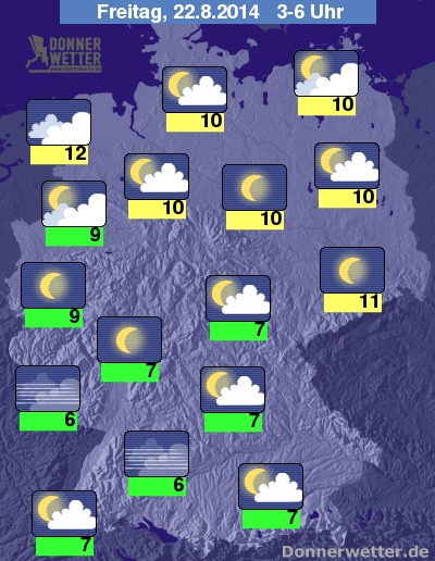 In der kommenden Nacht bleibt es im Norden und Nordwesten von Deutschland meist stark bewölkt, dabei bilden sich aber nur selten einzelne Schauer, sonst ist meist locker bewölkt, vor allem in der Südosthälfte des Landes auch vielfach sternenklar und es bleibt trocken. Die Temperatur sinkt auf 12 Grad in Ostfriesland und kühle 6 Grad am Schwarzwald.