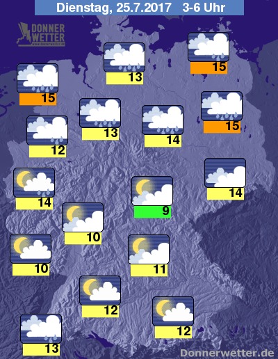 In der folgenden Nacht bleibt der Himmel bedeckt und hier fällt zum Teil langanhaltender und ergiebiger Regen. Sonst ist es auch gebietsweise stark, teils aber auch nur leicht bis aufgelockert bewölkt, dabei bilden sich vereinzelt Schauer und nur selten auch Gewitter. Die Temperatur sinkt auf 15 Grad in Emden und bis 9 Grad im Grabfeld.