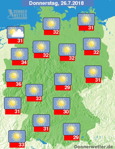Am Donnerstag bleibt es den Tag überwiegend sonnig, nur hier und da sind wenige Wolken unterwegs. Am Schwarzwald und am Bayerischen Wald sind vereinzelt Schauer und Gewitter möglich, sonst bleibt es aber trocken. Die Temperatur steigt auf 29 Grad in München und auf sehr heiße 36 Grad in Köln.