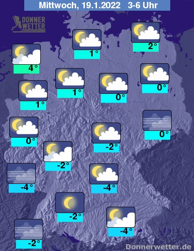 In der folgenden Nacht ist es verbreitet nur locker bewölkt oder sternenklar. Im Laufe der zweiten Nachthälfte verdichten sich die Wolken im Nordwesten jedoch wieder. Es bleibt überall trocken bei Tiefstwerten von 4 Grad in Cuxhaven und bis -4 Grad in Nürnberg.