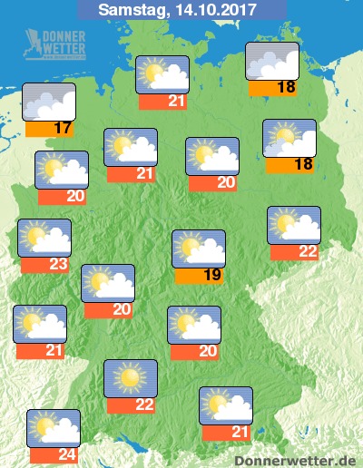Am Samstag halten sich im Umfeld von Nord- und Ostsee verbreitet dichte Wolken, dabei ist hier und da leichter Regen möglich, auch sonst ist es im Norden noch teilweise stark, zunehmend aber auch aufgelockert bewölkt und dabei trocken. Südlich davon herrscht verbreitet heiteres bis sonniges und dazu trockenes Spätsommerwetter. Die Temperatur erreicht 17 Grad an der Nordsee und bis 24 Grad im Oberrheingraben.