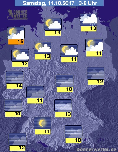 In der kommenden Nacht ziehen über den äußeren Norden und den Nordosten dichte Wolken hinweg, dabei fällt hier gebietsweise auch Regen. Im übrigen Norden ist es teils locker, teils stärker bewölkt, jedoch trocken. Im großen Rest des Landes zeigt sich der Himmel sternenklar, dazu bleibt es trocken. Die Temperatur sinkt auf 15 Grad in Bremerhaven und bis 10 Grad in Rosenheim.