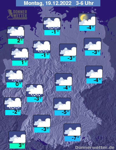 In der bevorstehenden Nacht ist es bereits landesweit bedeckt und von Westen setzt Schneefall, Schneeregen und teilweise gefrierender Regen ein, dabei besteht extreme Glättegefahr! Lediglich in den östlichen Landesteilen bleibt es bis zum Morgen noch weitgehend trocken. Die Temperatur sinkt auf 3 Grad im Breisgau und bis -7 Grad im Berchtesgadener Land.